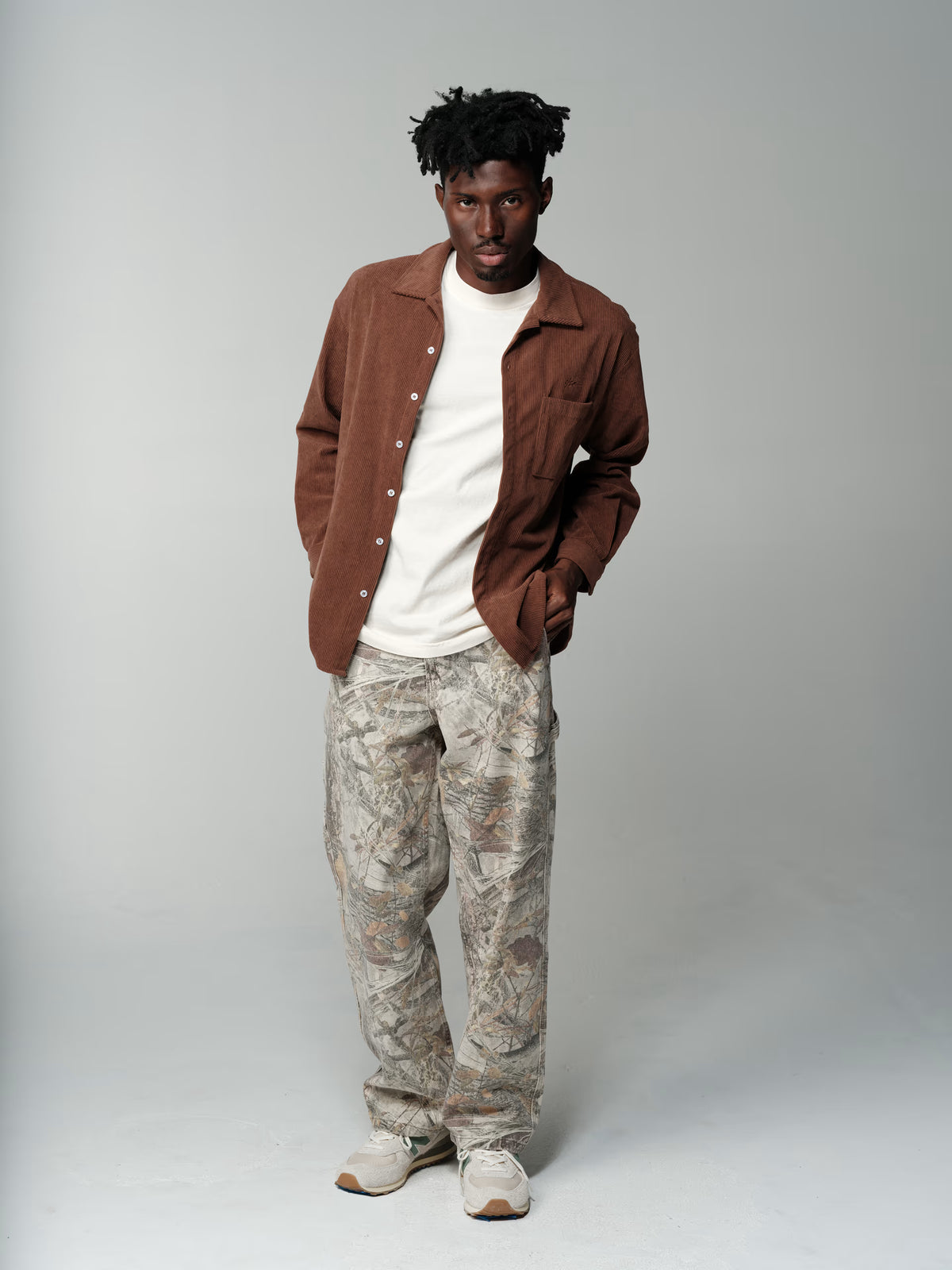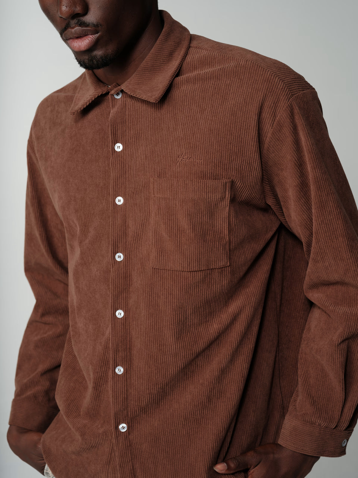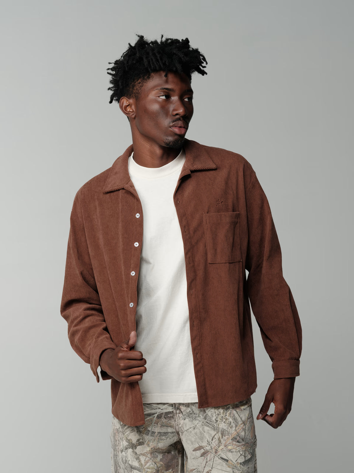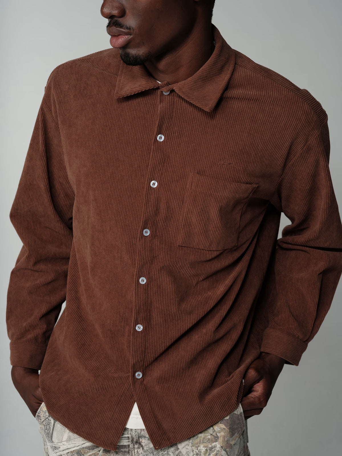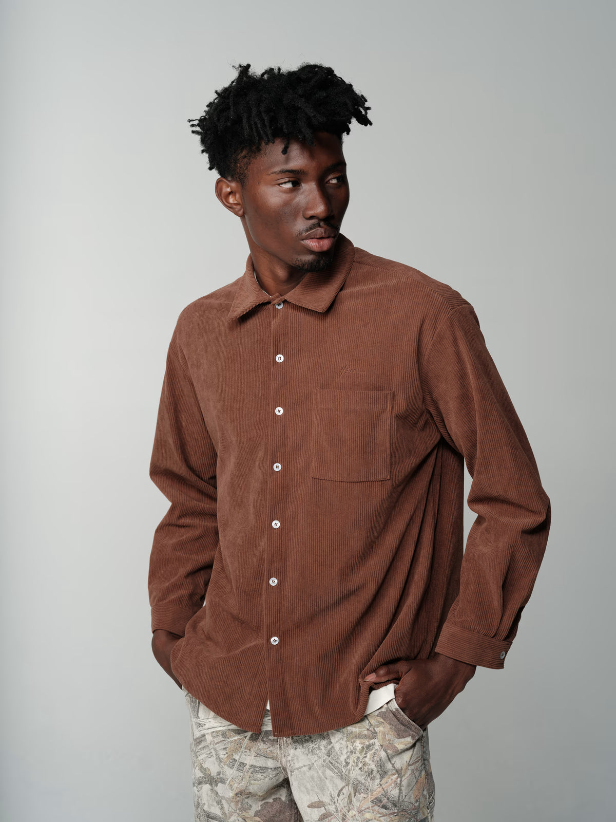 Cut from premium wide-wale corduroy, the fabric offers a substantial drape with soft texture, delivering warmth without excess weight. The ridged surface brings depth and character, while the relaxed silhouette ensures easy layering. A single chest pocket, tonal embroidery, and clean button closure emphasize craftsmanship over ornament.